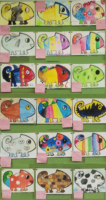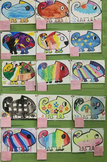 教室掲示より。色とりどりのユニークなカメレオンがいっぱい誕生しました。