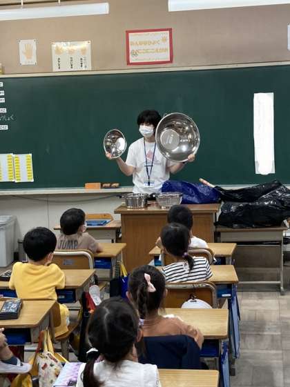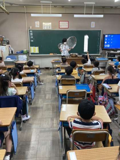 衛生管理上,調理室内へは立ち入ることができませんので,事前に栄養教諭が撮影しておいた調理の映像や,実物の調理器具(教材用で今は調理に使用していないもの)を使って,教室で調理場の探検をしました。