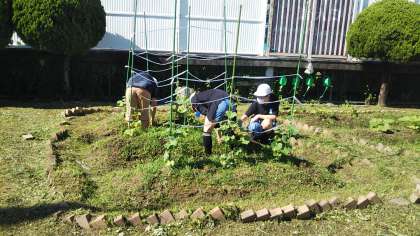 朝一から畑の草ぬきをしてくれています。育てているのはキュウリとカボチャ。大きな花がついていて、いい実がなりそうです!