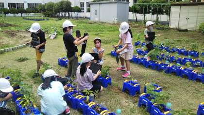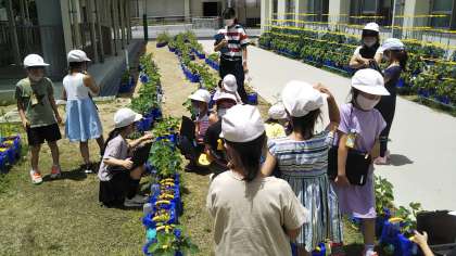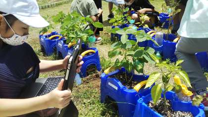 2年生が学習園で栽培している野菜(ピーマン、ナス、枝豆、シシトウ、オクラ、トマト、ミニトマト)がぐんぐん成長しています。すでに大きな実がついているのもあります。GIGA端末で写真を撮ってレポートにまとめます。楽しみですね!