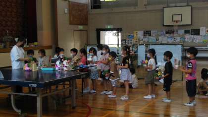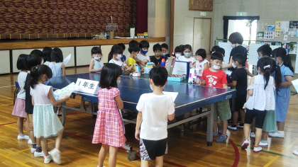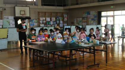 1年生が体育館に『夏休み作品展』の作品を搬入しています。こわさないように、ちゃんと前見ててねー!