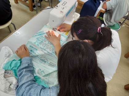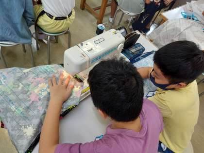 エプロン作りも、ついにミシンが始まりました。