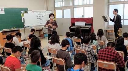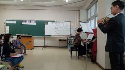 音楽担当の尾原先生が、校内公開授業を行いました。伊藤先生がホルンで参加し、生演奏でいろんなタイプの曲を鑑賞しました。