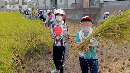 6月の田植え体験で植えた稲が立派に育ちました。今年は害虫も少なく素晴らしい出来とのことです。ご協力いただいた地域の皆様、保護者の皆様、ありがとうございました!