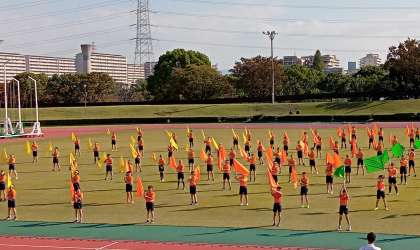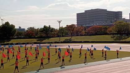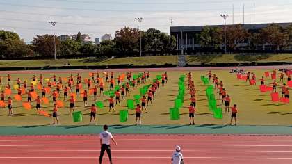 ●6年生 陸上記録会より 公開日 2021/10/28 更新日 2021/10/28 6年生 団体演技です。途中で音楽が消えるトラブルが起こっても、全員が気持ちを一つにして、音楽なしで最後まで乱れずに演技を続けました。