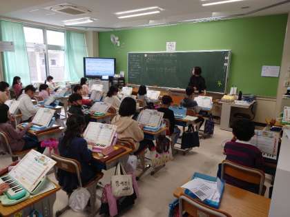鍵盤ハーモニカを演奏していました。先生の拍に集中して,音をそろえていました。