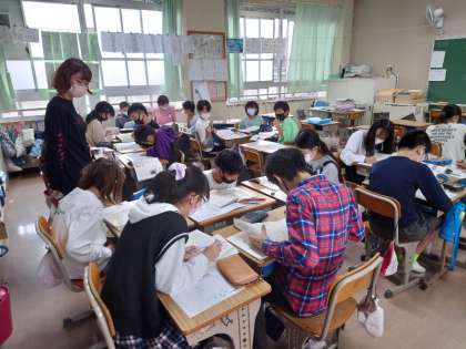 宮沢賢治の生き方について,班で話し合っていました。どのような人物であったか「やまなし」の作品や賢治の生き方を通して考えていました。
