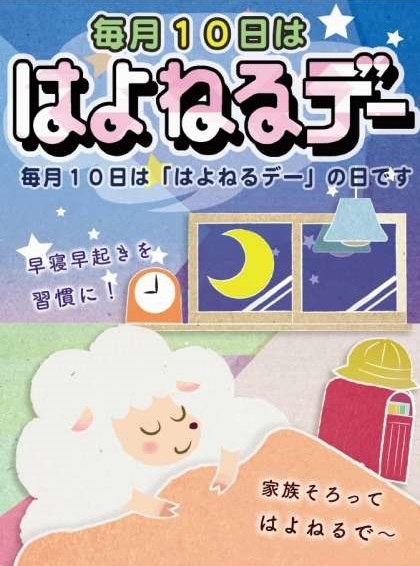 ●毎月10日は・・・ 公開日 2021/11/10 更新日 2021/11/10 トピックス 『はよねるでー』の日! 今週になってずいぶんと寒くなりました。 今日は、いつもより早く布団に入って暖かくして寝てください!