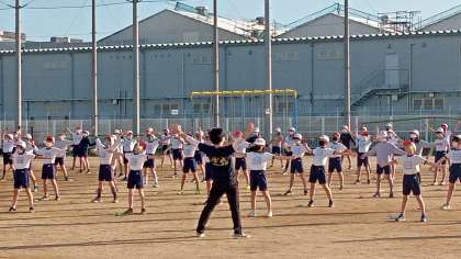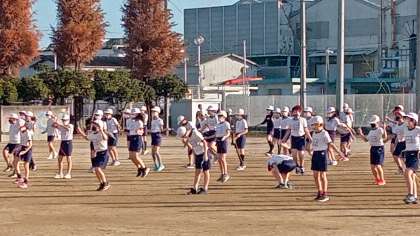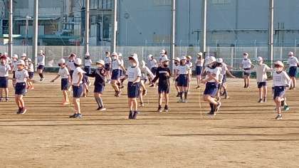 今日は5年生です。ラジオ体操でウォーミングアップ後、なわとびで一気に心拍数を上げます。