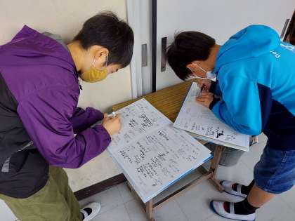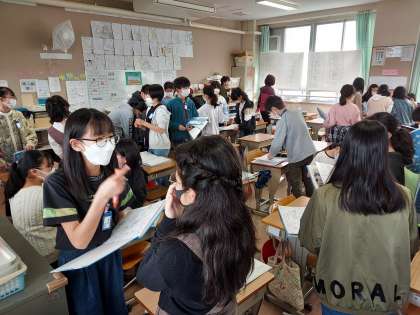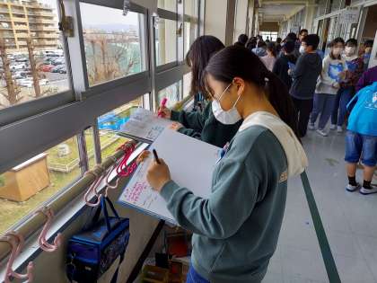 最後の思い出に、クラス関係なく、卒業アルバムにメッセージを書きあっています。皆、笑顔がはじけています。