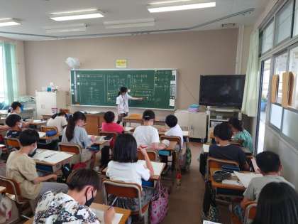 分数×分数の計算について学習しています。途中で約分できるときは約分して計算しています。みんな見落としがないか注して計算していました。