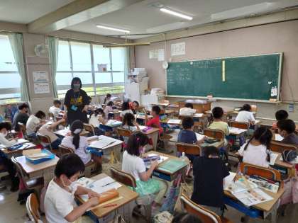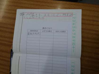 「ものの長さを,よそうして,竹ものさしではかろう」をめあてに学習しています。まずは,はかりたいものを選んで予想しています。
