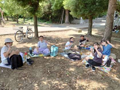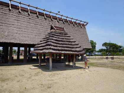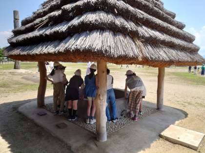 お弁当を食べたあとは、高床式倉庫の復元を見学。みんなしっかり学習しています。
