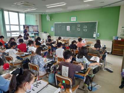 6年の先生が書写の授業をしています。子どもたちはとても集中して,書いていました。