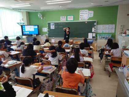 上水道と下水道について学習しています。先生の身振り手振りを使った説明に集中して聞いていました。