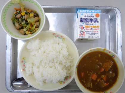 本日の献立はご飯、牛乳、カレーライス、小松菜サラダです。