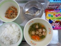 本日の献立はご飯、牛乳、さつま汁、鰯の甘酢かけ、福豆です。