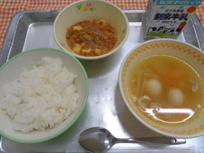 『ごはん・牛乳・コーンとうずら卵のスープ・麻婆豆腐』です。