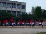 体育参観、フラッグの練習です。  赤色のクラスです。動きがそろうと、とてもきれ...