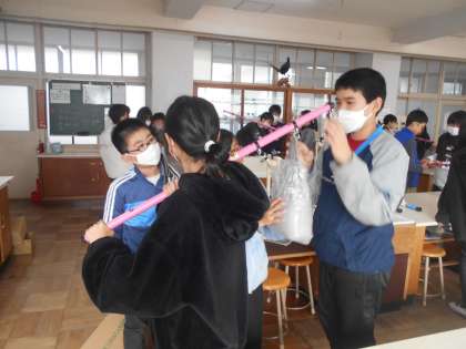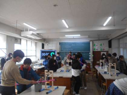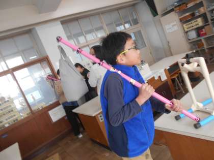 今日は、ぼうやおもりを使って、力点、支点、作用点のはたらきを確かめる実験をしています。