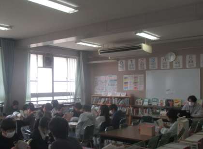 2組の国語では、図書の時間に図書室で静かに読書をしていました。