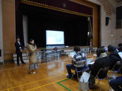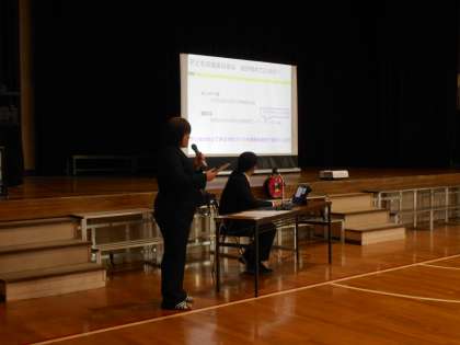 学校長からのあいさつのあと、主幹教諭より学校概要、日課表、徴収金などの説明、1年学年主任より、入学までにできるようにしてほしいことや準備について、通級指導の先生より教育相談についての説明を行いました。最後に、子供会の保護者の方からから子供会についての説明も行われました。