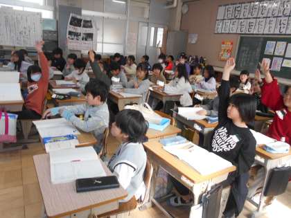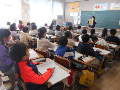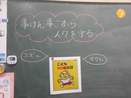 先生が「こども100番のイラスト」を準備していて、その旗について知っていることを発表しています。
