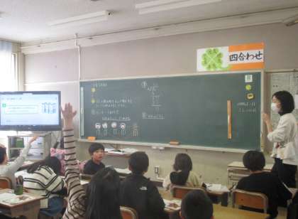3組の算数では、6リットルの飲み物を4人で等分したとき1人文は、何リットルになるかについて求める学習をしていました。