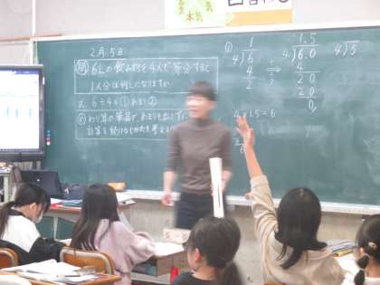 2組の算数では、6÷4の計算であまりをださずに計算を続ける仕方について学習していました。