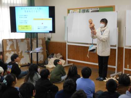助産師さんに来ていただいて赤ちゃんがうまれるしくみや命の大切さを教えていただきました。