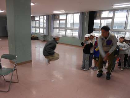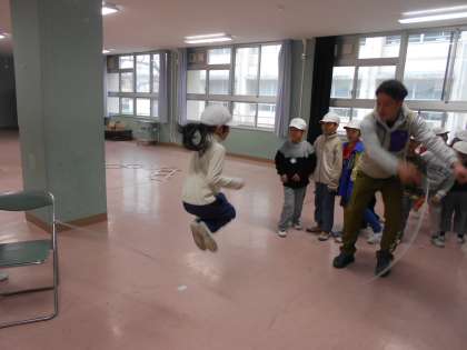 多目的室で、大なわ跳びの練習に取り組んでいます。