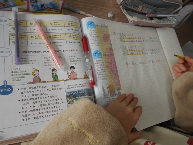 「電流の向き」や「電流の大きさ」について学習のまとめをしています。