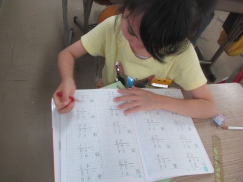 計算ドリルの答え合わせをしたあと、「くりさがりのあるひっ算をマスターしよう」に取り組んでいました。