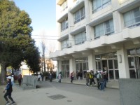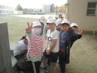 運動場で東館の校舎の日影を上手に使って,連運にむけての自主練習をしています。