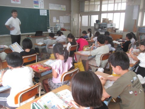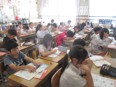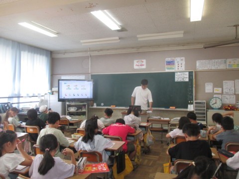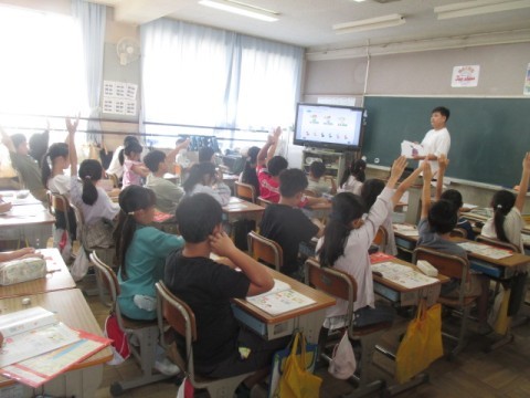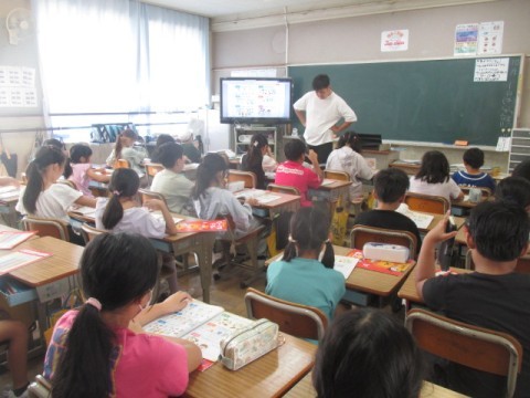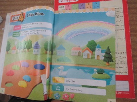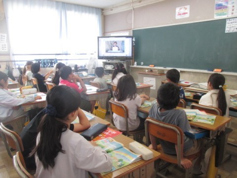 教科書にある自分の虹色をかんせいさせたあと,映像を見ています。自分の虹と世界の子どもたちが描いた虹を比べています。