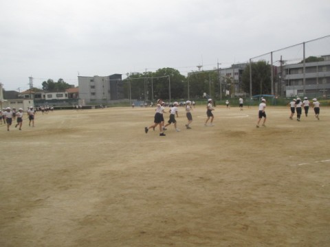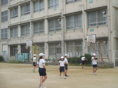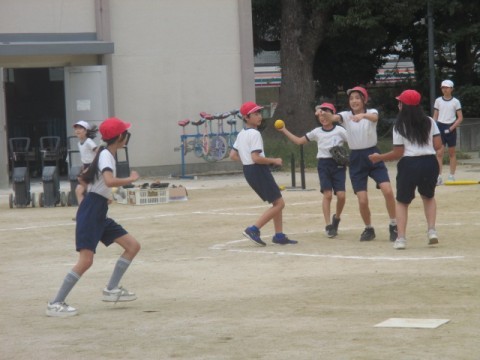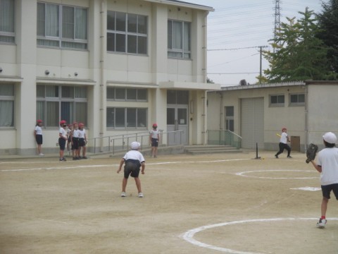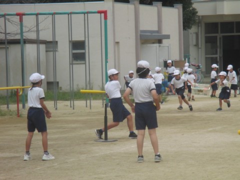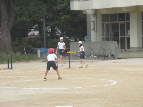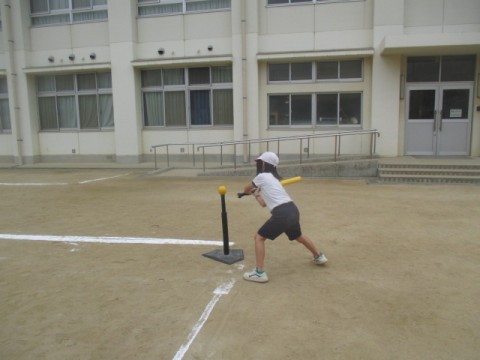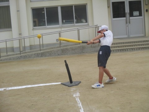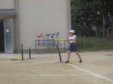 1組の体育の時間です。「Tバッティング」に取り組んでいます。