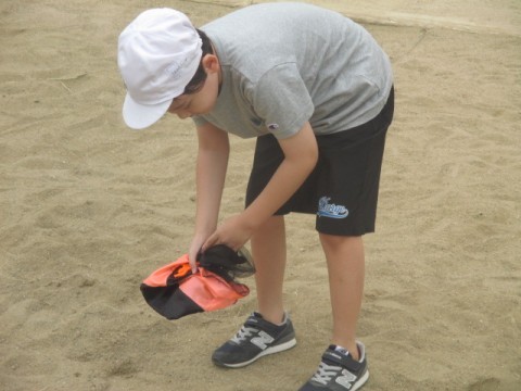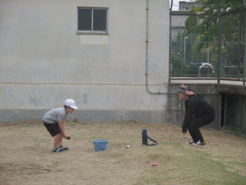 砂場で何やら道具を飛ばしています。