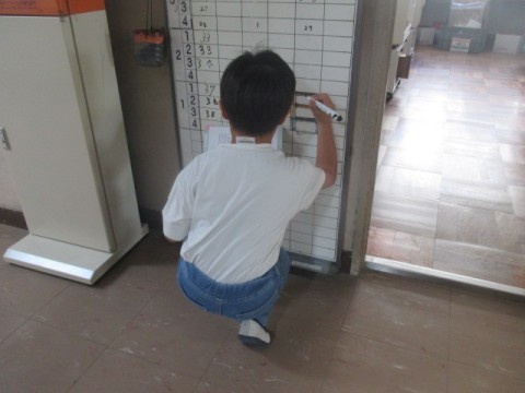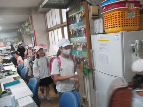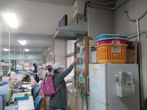 8時になり職員室へ自分の教室の鍵を取りに来ています。