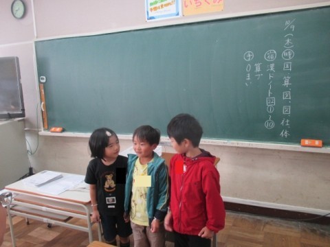 朝の時間に1年1組の代表の子どもたちが6年1組の教室へ行くところに出会いました。