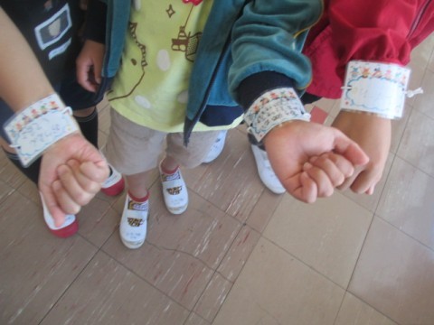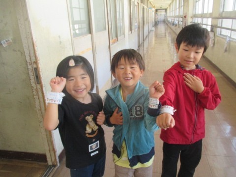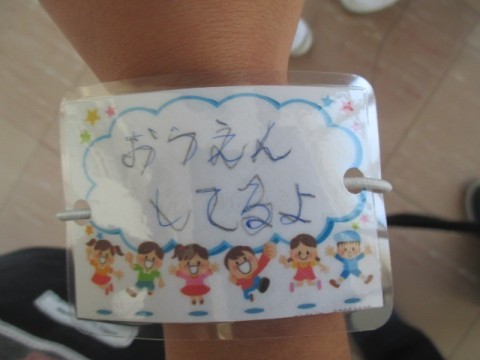 1年生は6年生に「連合運動会がんばってください」「応援しています。」等と書いた手作りのメッセージ入りのブレスレット(リング)を作りました。そして6年生に渡しました。