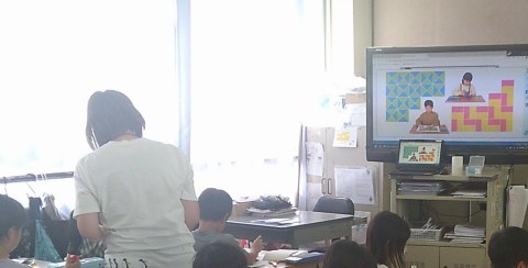 1組の算数では,長方形を切ってつくりすきまなくならべて形を作っていました。