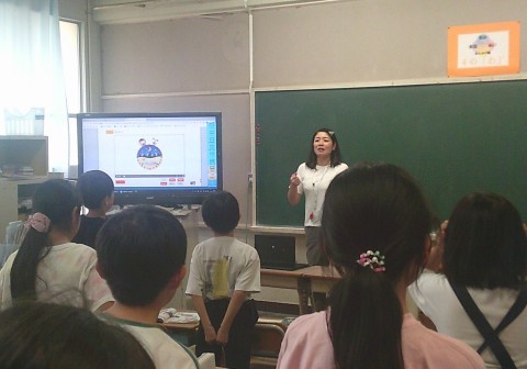 3組の外国語活動では,What time is it? の構文やいろいろな時間における様子を英語で理解する学習に取り組んでいました。