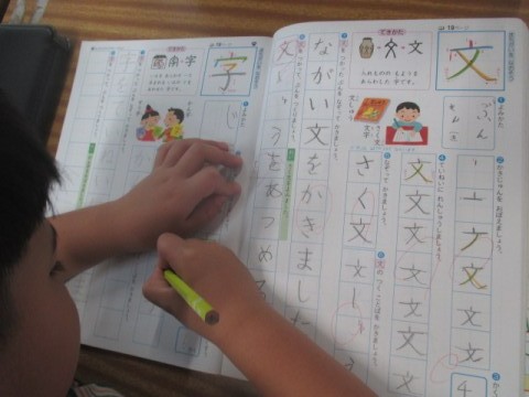 1組の国語の時間です。新出漢字「文」「字」を学習しています。
