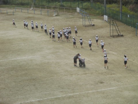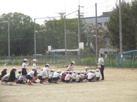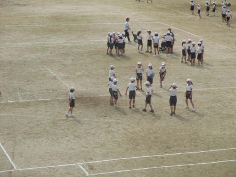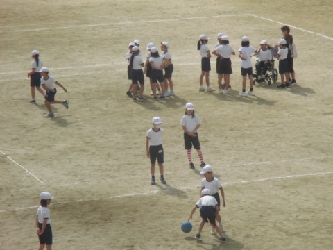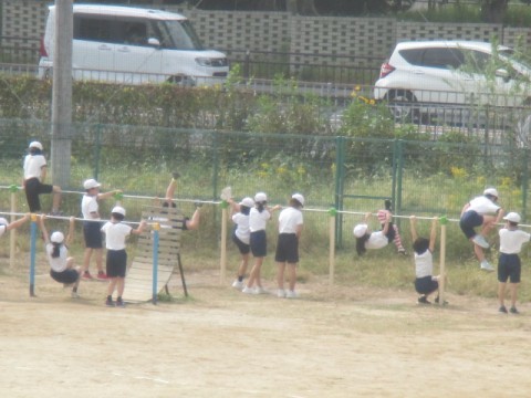 運動場で「ラインポートボール」,「鉄棒」に取り組んでいます。
