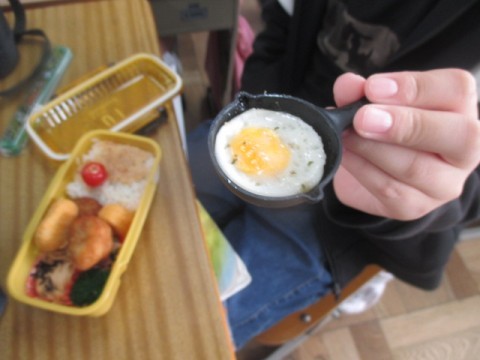 ウズラたまごでしょうか?小さなかわいいフライパンに入っています。「せんせい,これ,電子レンジで作ってるねん。」と教えてくれました。