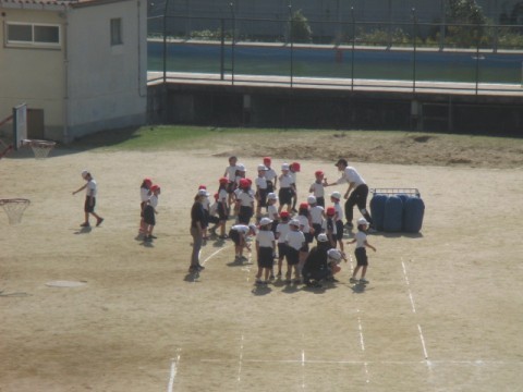 体育では,「サークルシュートゲーム」に取り組んでいました。