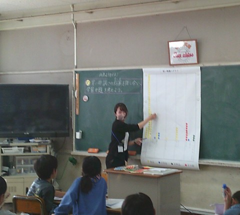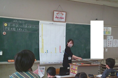 3組の社会では,買い調査の結果を話し合い学習に取り組んでいました。