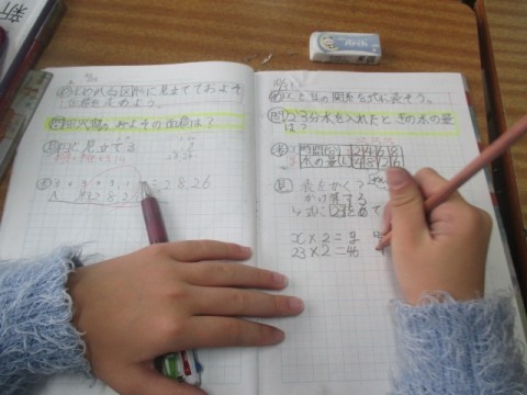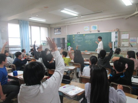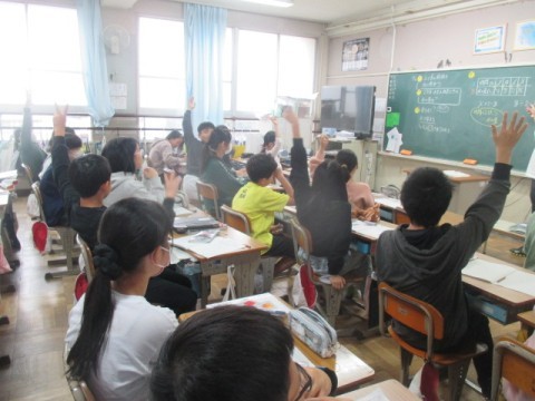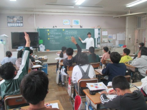6年 学習の様子2 公開日 2025/11/03 更新日 2025/11/03 6年生 10月31日(金)2組の理科では,月と太陽について学習していました。算数では「Xとyの関係を式にあらわそう」の学習です。今日は「23分水を入れたときの水の量は?」の問題に取り組みます。 +5
