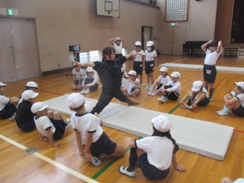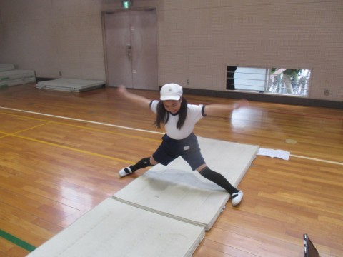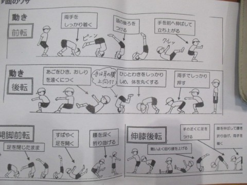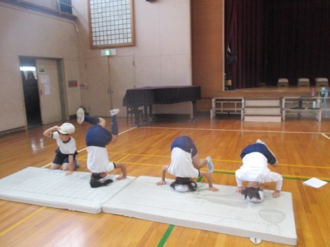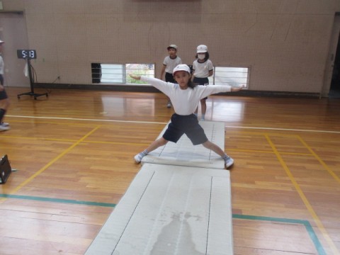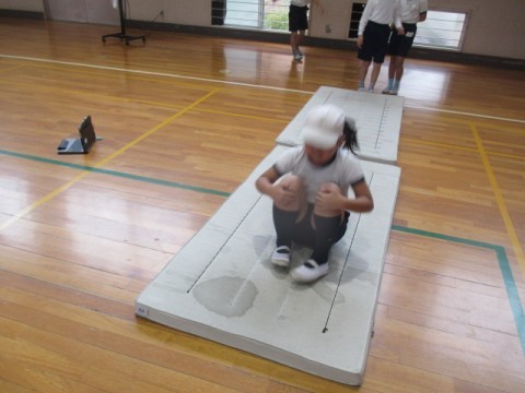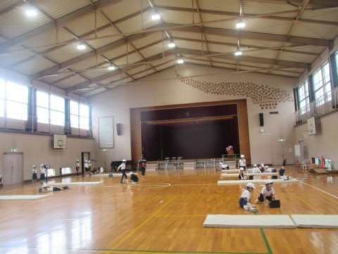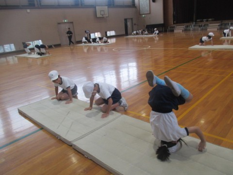 体育館でマット運動に取り組んでいます。今日は「前転」「開脚前転」の練習をしています。