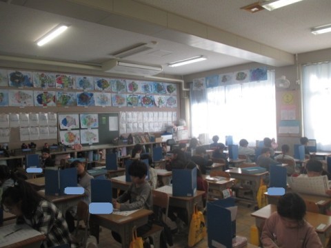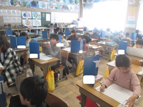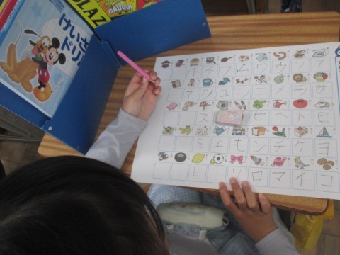 「かいてみましょう」のテストをしています。学習したカタカナのテストです。